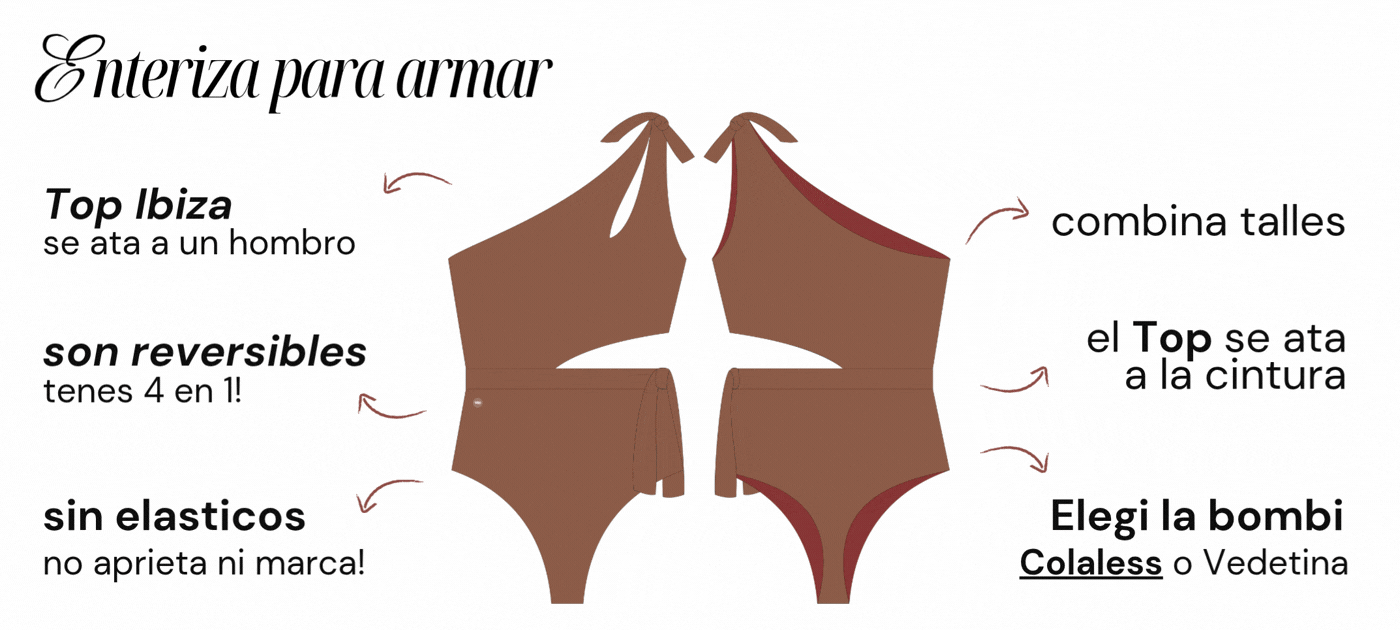 Es un conjunto de 2 piezas que, al usarlo, simula una enteriza. Como las prendas vienen por separado, podés elegir distintos talles arriba y abajo, y también el tipo de bombacha: colaless o vedetina.