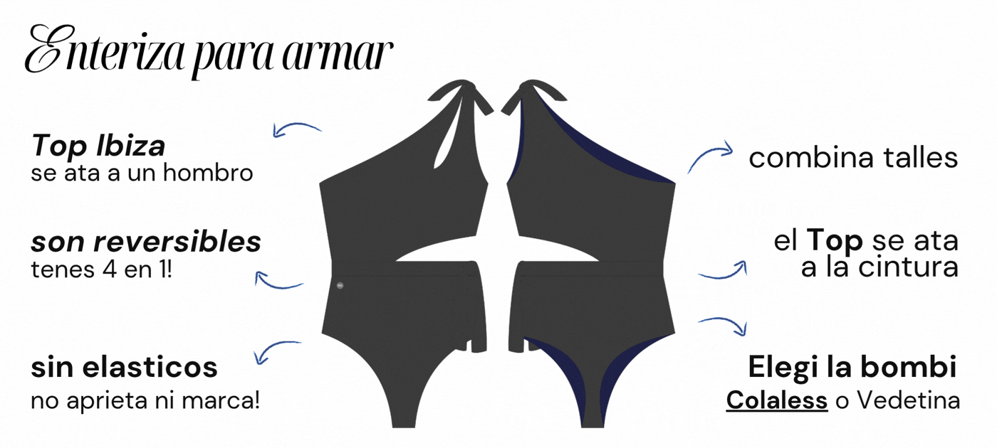 Es un conjunto de 2 piezas que, al usarlo, simula una enteriza. Como las prendas vienen por separado, podés elegir distintos talles arriba y abajo, y también el tipo de bombacha: colaless o vedetina.